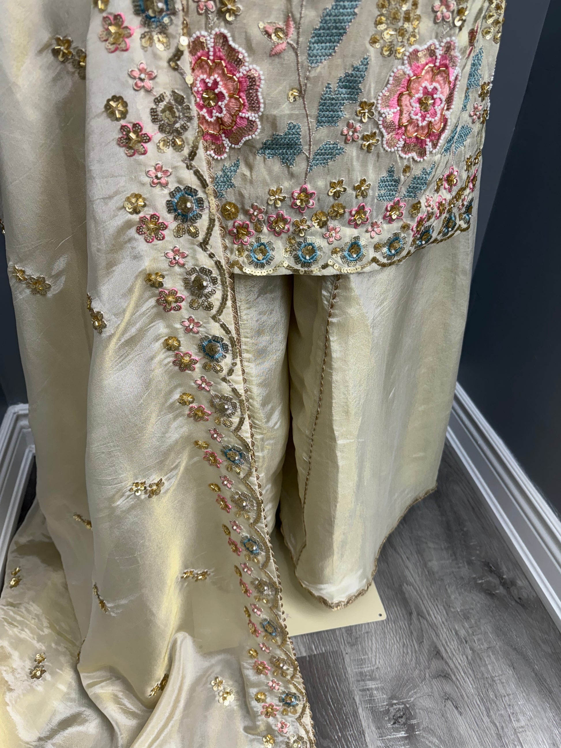 This stunning shimmer suit features intricate multicolour work throughout, with a beautiful the sharara and dupatta. The traditional floral design adds a touch of elegance to this ensemble, making it a perfect choice for special occasions.
