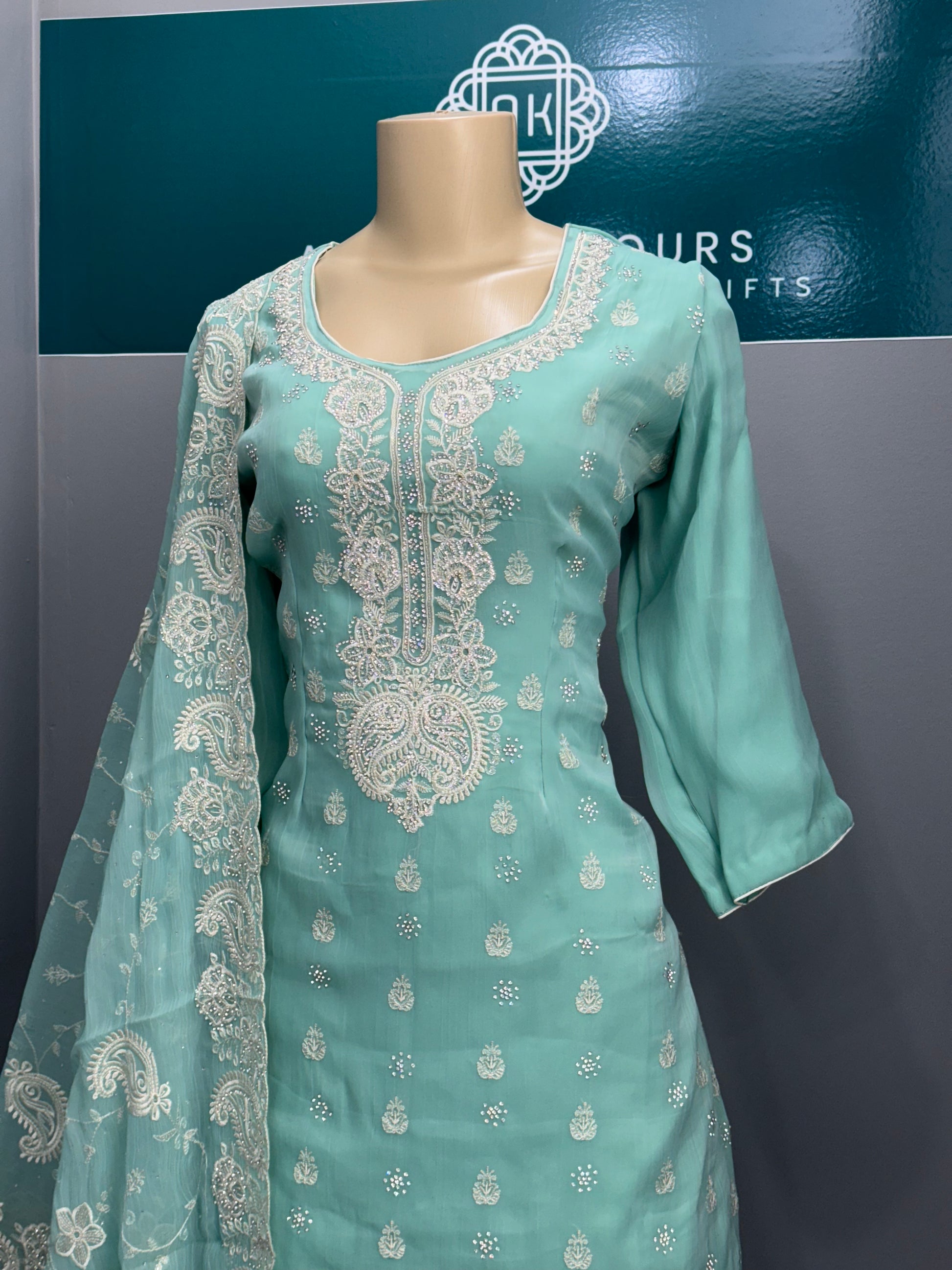 Enhance your style with this beautiful embroidered Salwar Suit. This stunning suit features gorgeous stone work for a touch of elegance. The embroidered dupatta completes the look. Elevate your wardrobe with this must-have piece.