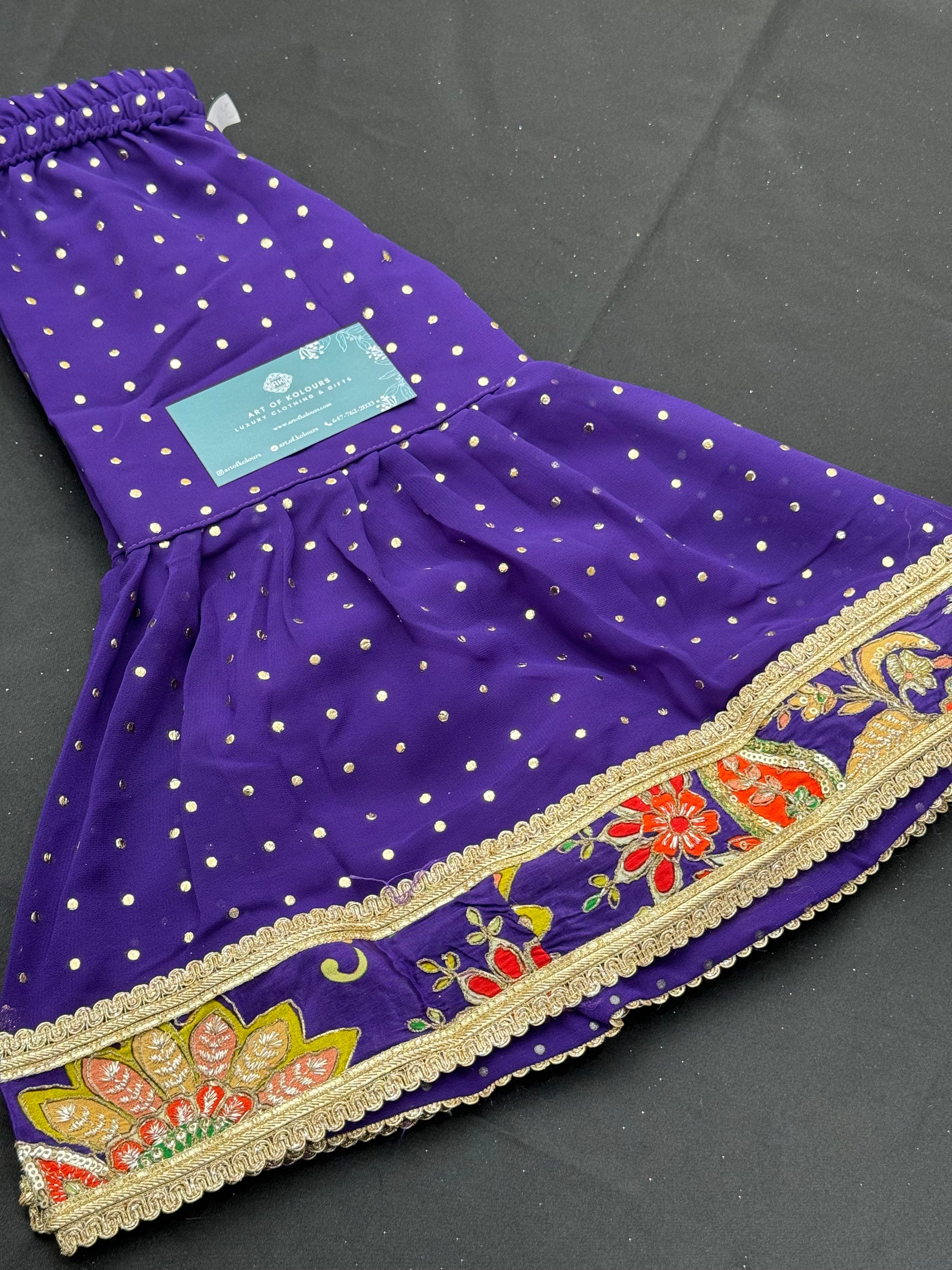 Introduce your little one to the world of ethnic fashion with our Sukhpreet Kids Gharara Suit. This beautiful purple coloured suit features vibrant multi-coloured embroidery, adding a touch of elegance and charm. Made with high quality materials, it will provide comfort and style for your child. Perfect for any special occasion, make your child stand out with this stunning outfit.