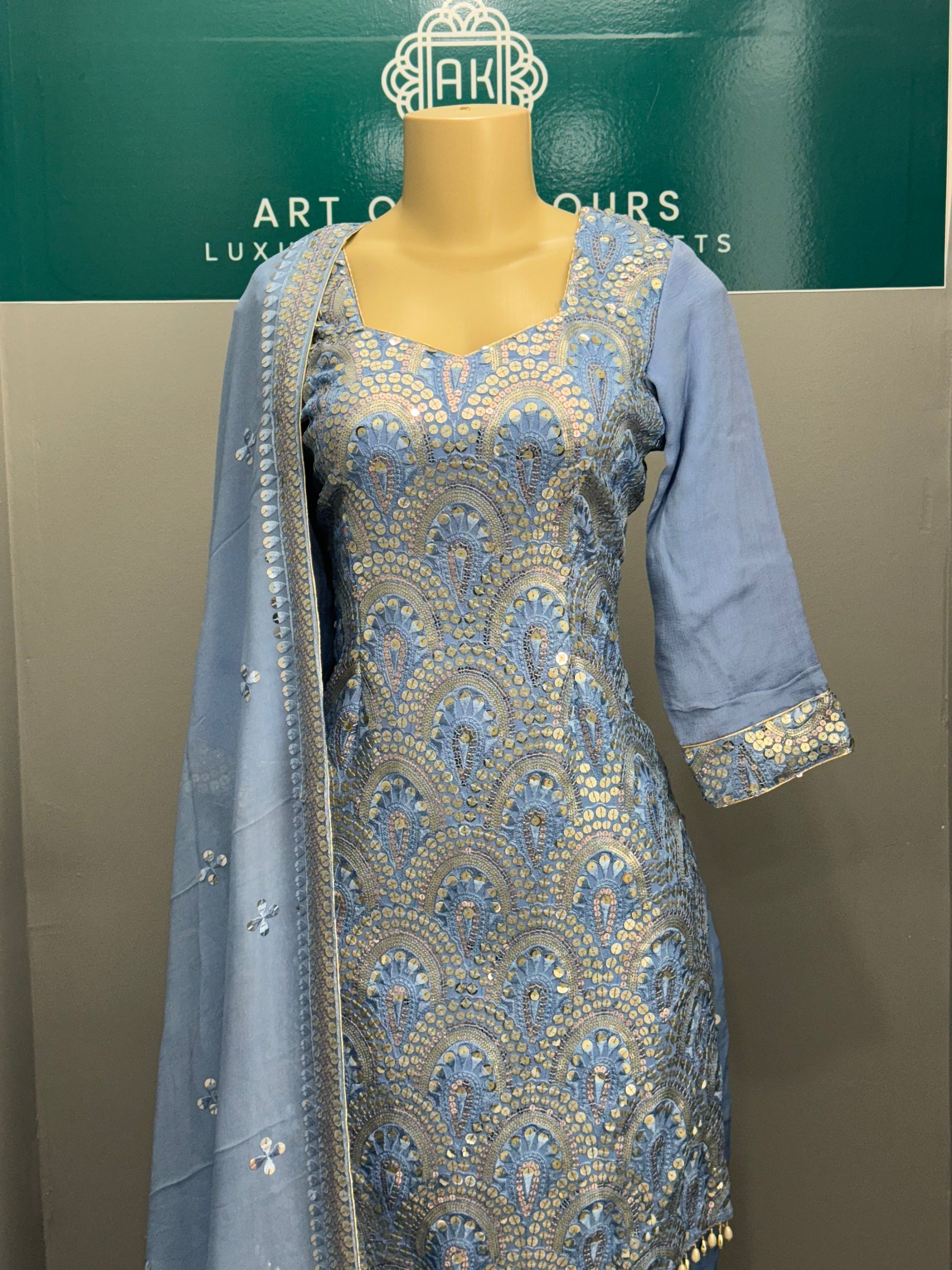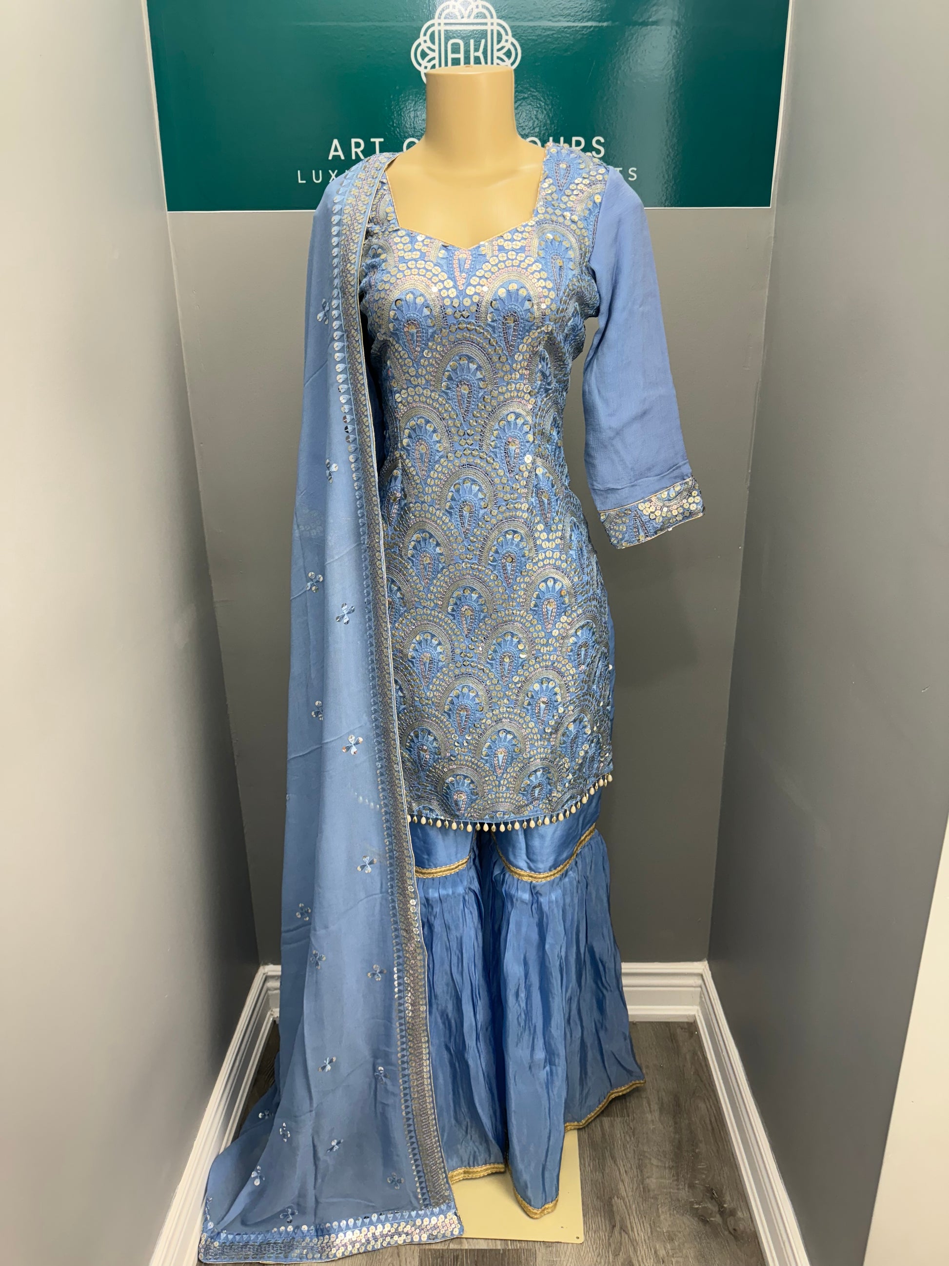 Enhance your style with this beautiful Gharara Suit. This stunning suit features gorgeous and intricate sequin work for a touch of elegance with pink and orange contrast dupatta that completes the look. Elevate your wardrobe with this must-have piece.