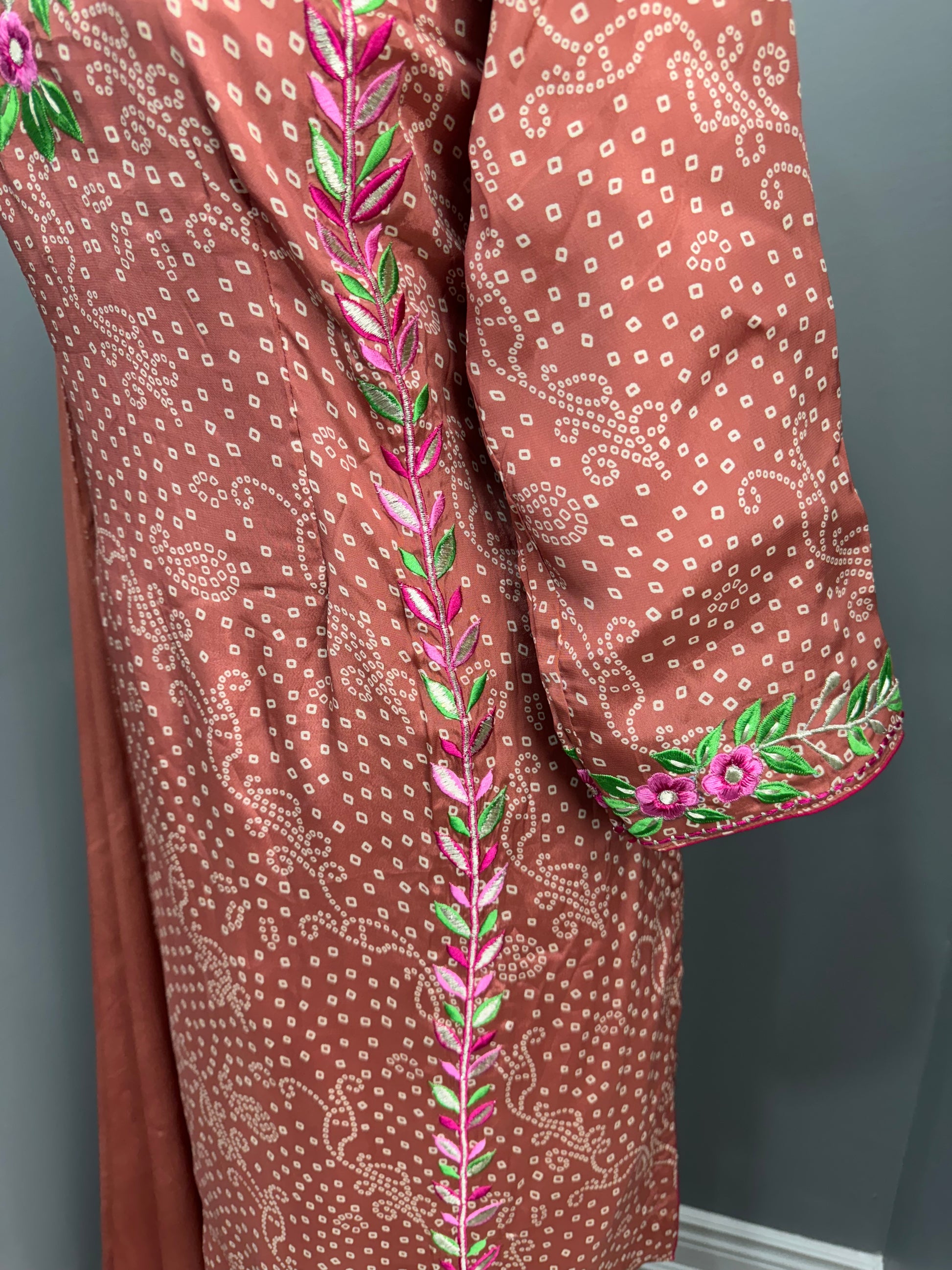 This Tread Work Bindi Bhandhi Print Salwar Suit in cooper colour offers a unique blend of traditional and modern styles. The intricate tread work and Bindi Bhandhi print add a touch of elegance to the overall design. Made with high-quality fabric, this suit is both comfortable and stylish.