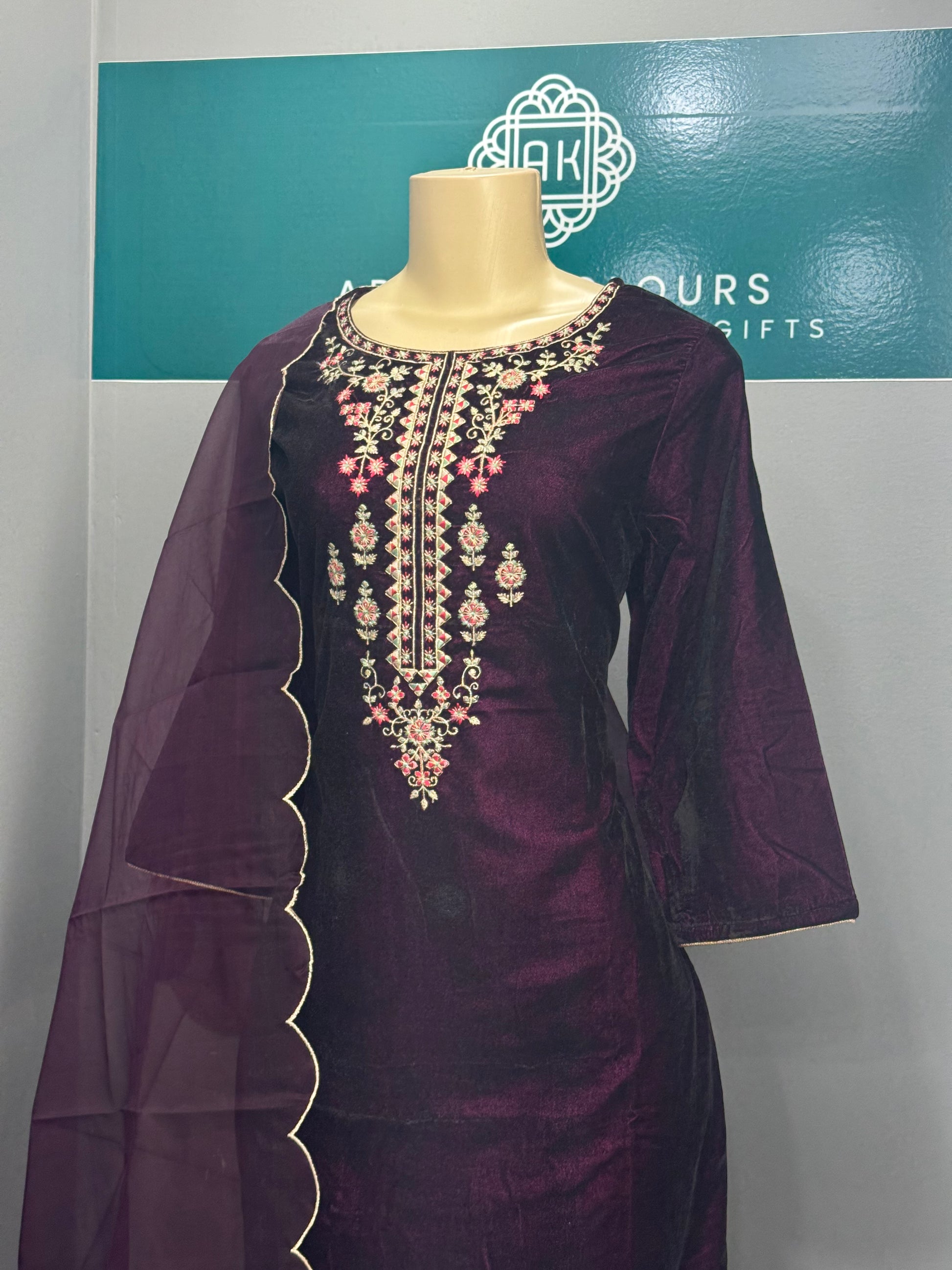 This Velvet Plazo Suit is expertly crafted with beautiful embroidery work, creating a truly beautiful and elegant garment. Made with the high quality materials, it is both comfortable and stylish. Perfect for any occasion, this suit is sure to make you stand out in a crowd.